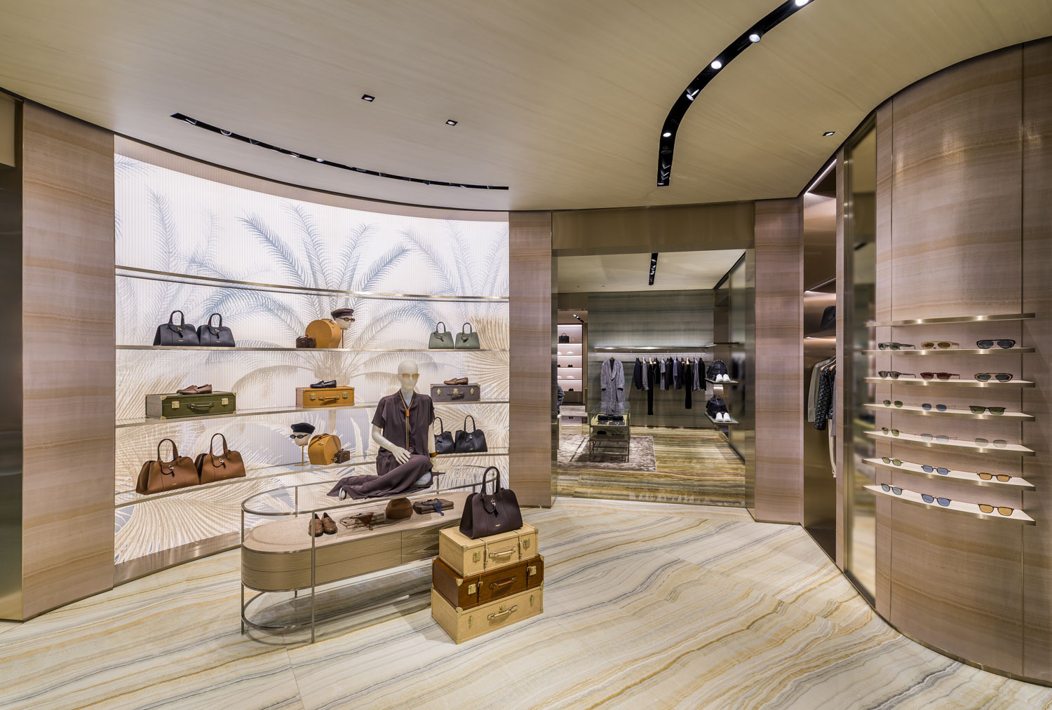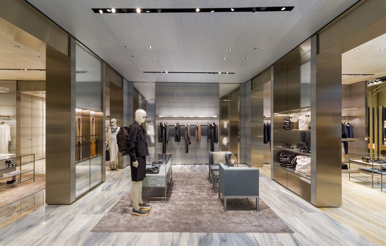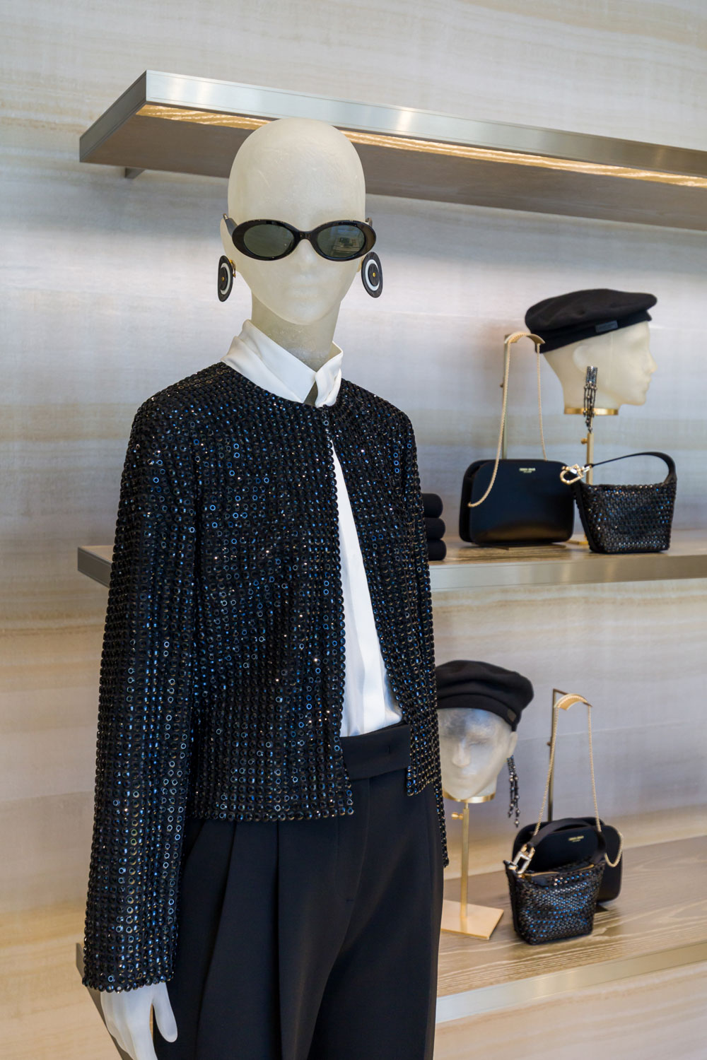 The photographs document the architecture, interior design and visual merchandising that define the brand’s retail environments.