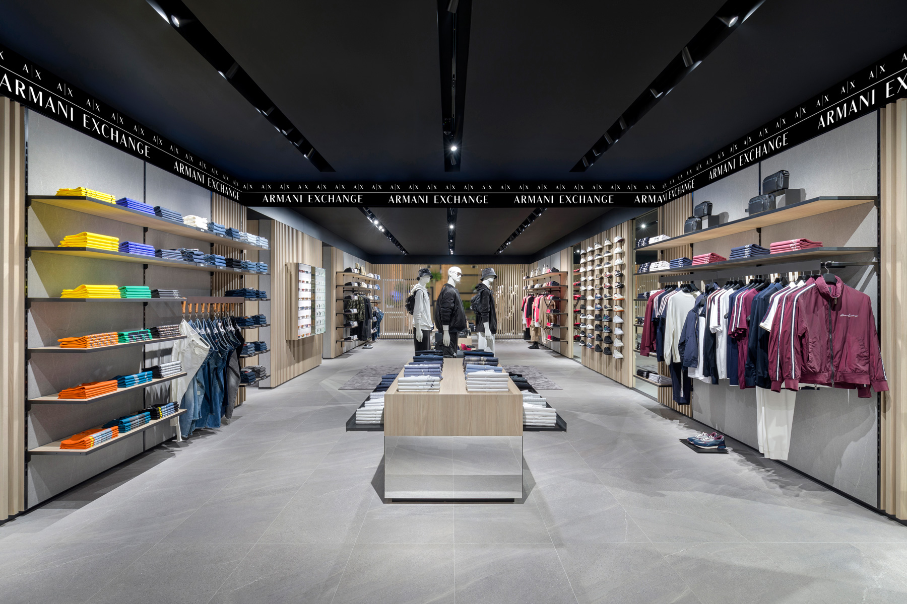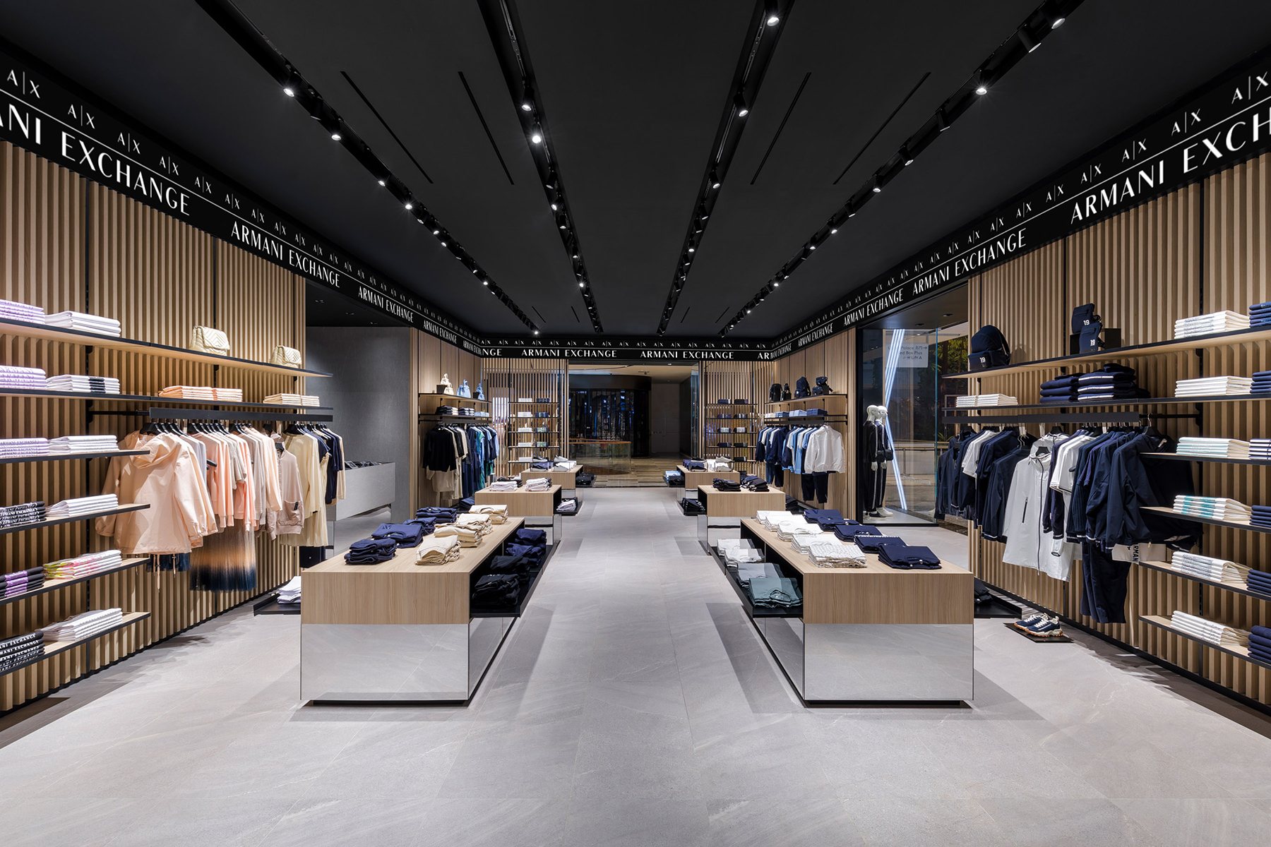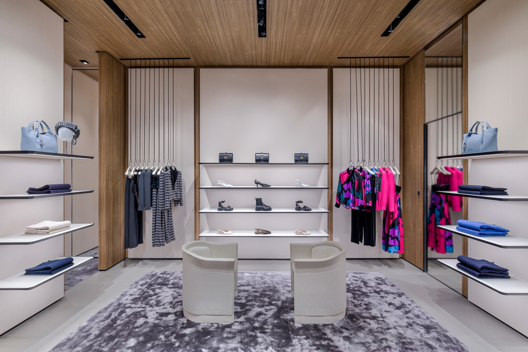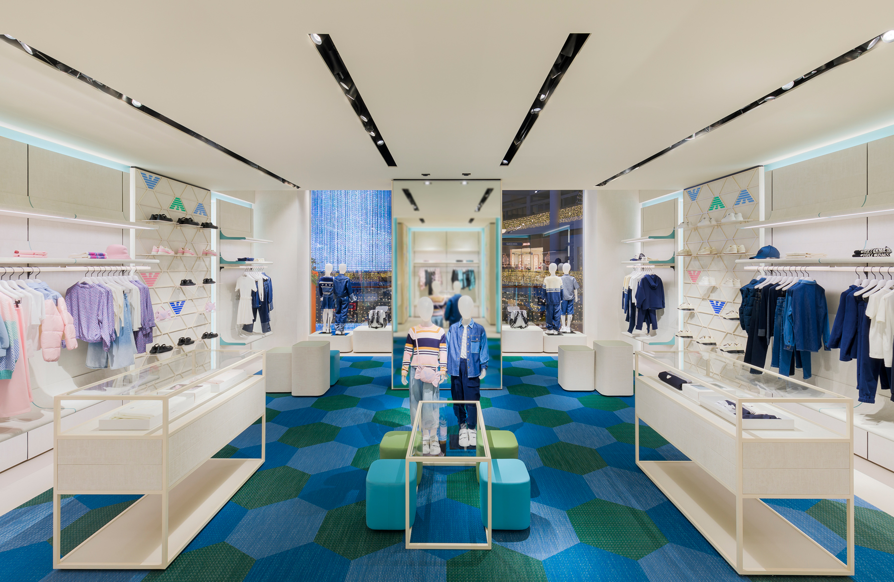 The photographs document the architecture, interior design and visual merchandising that define the brand’s retail environments.